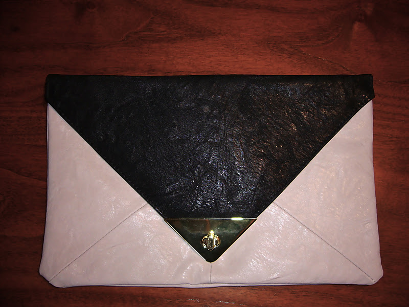 pochette bicolor di ecopelle con punta- chiusura di metallo. Prezzo: circa 19 euro. Spedizione rapidissima, confezione molto curata, prodotto di ottima qualità. Zero spese di spedizione. Grande soddisfazione!!!