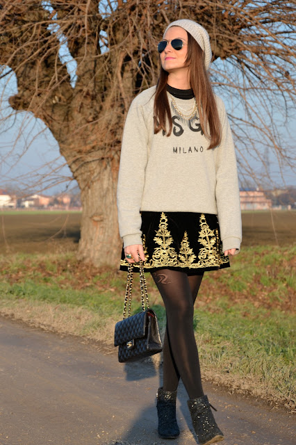 | Sweatshirt: MSGM; dress as a skirt: Choies; bag: Chanel; ring: YSL; sunnies: Sunglasseshop.com, boots: Giuseppe Zanotti. |