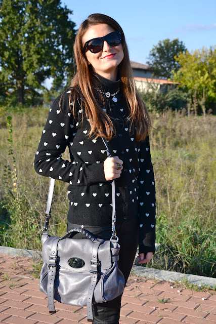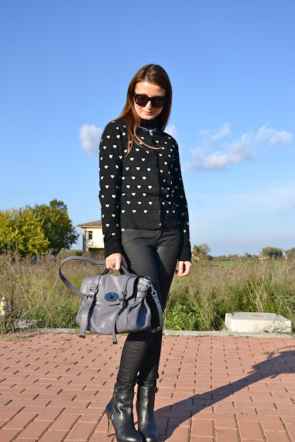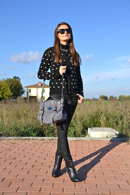 | Buona domenica a tutti!!! Oggi look total black addolcito dai cuoricini del cardigan. Che mi dite dei pantaloni? Credo di aver trovato finalmente i jeans perfetti per me: comodi, super skinny e morbidissimi, che si adattano a tutti i movimenti perchè leggermente elasticizzati. Li adoro. Sono di Pepe Jeans, date un’occhiata al loro fornitissimo online store! Ed ora…momento di autopromozione (ahahahaha!): nella sidebar laterale a sinistra ho messo il badge della mia fanpage di facebook. Siccome non ho creato la pagina da tantissimo tempo, ha bisogno di crescere, mi date il vostro supporto cliccando e mettendo il vostro “mi piace”? Grazie e un bacione grande! Good sunday to all! Today, total black look softened by my cardigan with hearts. What about the pants? I think I’ve finally found the perfect jeans for me: comfortable, super skinny and soft, which are suitable for all movements because slightly elastic. I love them, by Pepe Jeans. Take a look at their well-stocked online store! And now…the moment of self-promotion (ahahaha!): in the sidebar on the left-side I put the badge of my Facebook fanpage. Since I haven’t created the page for a long time, it needs to grow up, please give me your support by clicking and putting your “like”! Thank you very much! Kisses. |