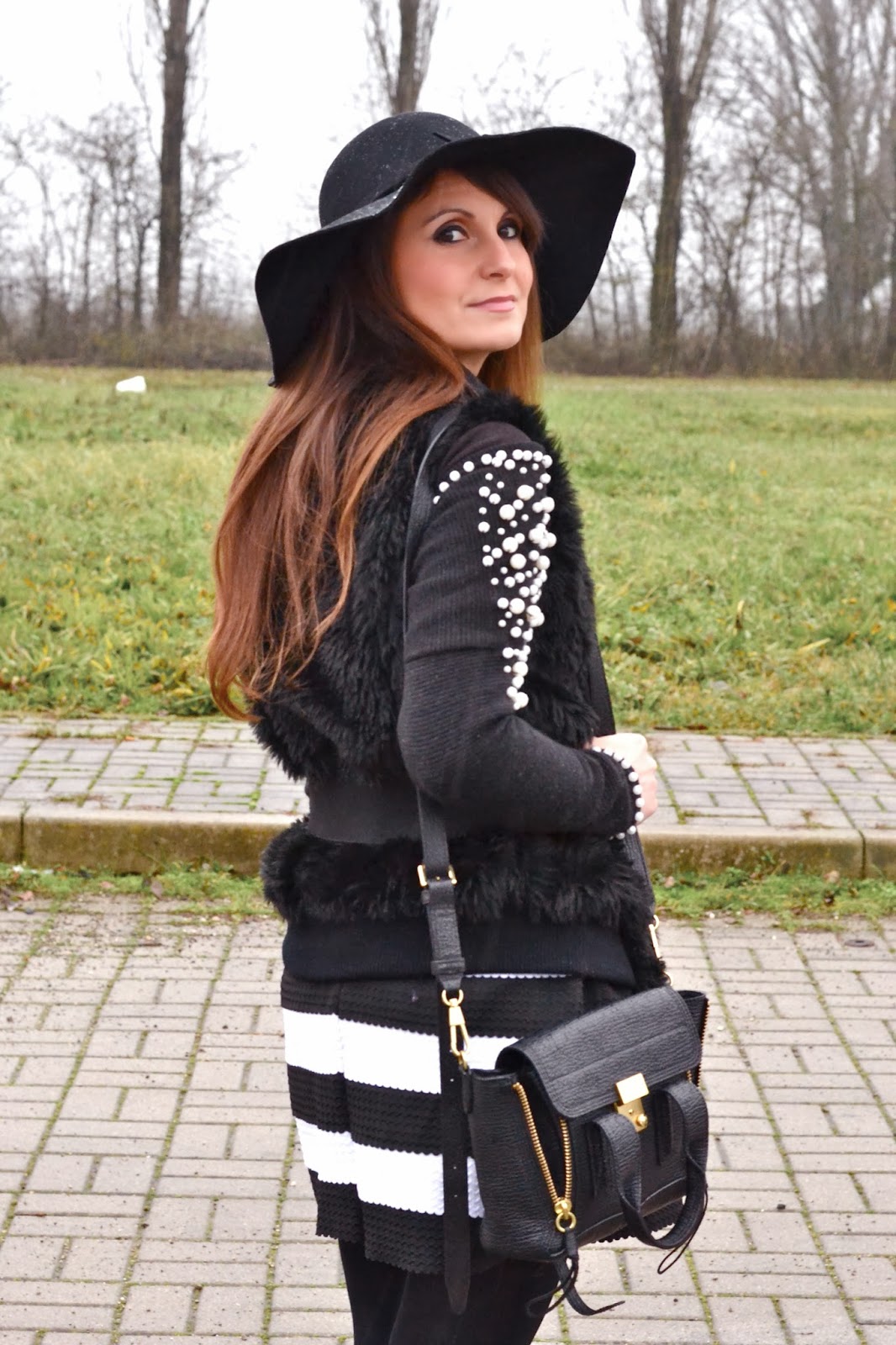 | Buongiorno a tutti, come va? Stamattina mi sono alzata con la neve e non c’è niente di più bello nel potersela godere durante il giorno libero dal lavoro! Quando abbiamo scattato queste foto invece pioveva. Anzi, a dirla tutta, ha iniziato a piovere proprio quando siamo scesi dalla macchina per fare le foto, un diluvio improvviso, la classica nuvoletta di Fantozzi! Ormai eravamo già pronti, perciò abbiamo fatto ugualmente alcuni scatti in fretta e furia. Se iniziava a piovere prima di uscire di casa col cavolo che facevamo le foto con la pioggia, è una cosa impossibile secondo me. Si bagna tutto, la macchina fotografica, le gocce negli occhi, la mia faccia che è più assurda del solito… Bè insomma, veniamo a noi, questo è il risultato: un ritorno al buon vecchio black and white con la gonnellina di Oasap che io trovo adorabile, (ora è in sconto e costa solo 18 $) un maglione con le perle (che in realtà sarebbe un abitino) e il gilet di ecopelliccia che ormai avete visto tante volte. Vi piace? Buona giornata e…indovinate cosa farò oggi! Hello everyone, how are you? This morning I woke up with snow and there is nothing more beautiful in enjoying it during the day off from work! When we took these pictures it was raining instead. In fact, to be honest, it started to rain right when we got out to take pictures, a sudden flood! If it started to rain before leaving our house, we sure didn’t take photos with the rain, it is an impossible thing for me. Gets wet the camera, the drops in your eyes, my face that is more absurd than usual… Well then, come to us, this is the result: a return to the good old black and white skirt bought on Oasap that I find really lovely, (now costs only 18$) a sweater with pearls (which would be a dress ), and the faux fur vest by now you’ve seen it many times. Do you like? Have a nice day and… guess what I’ll do today! |