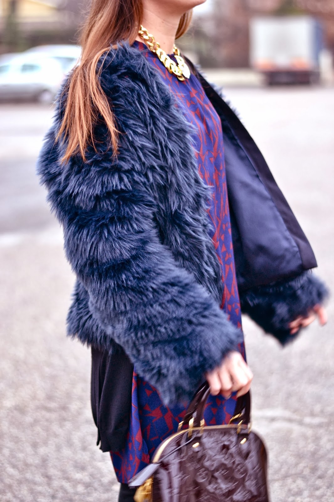 Bordeaux e blu, che per effetto ottico richiamano il viola. Un mix che mi fa impazzire. Un abitino leggero dalle fantasie geometriche e caleidoscopiche e un pellicciotto sintetico per stare calda. E anche una giornata grigia e noiosa prende colore. Buon week end! Kiss! Burgundy and blue, optical effect reminiscent purple. A mix that makes me crazy. A light dress from kaleidoscopic geometric patterns and a faux fur to keep warm. It also takes a day dull and boring color. Happy weekend! Kiss! |