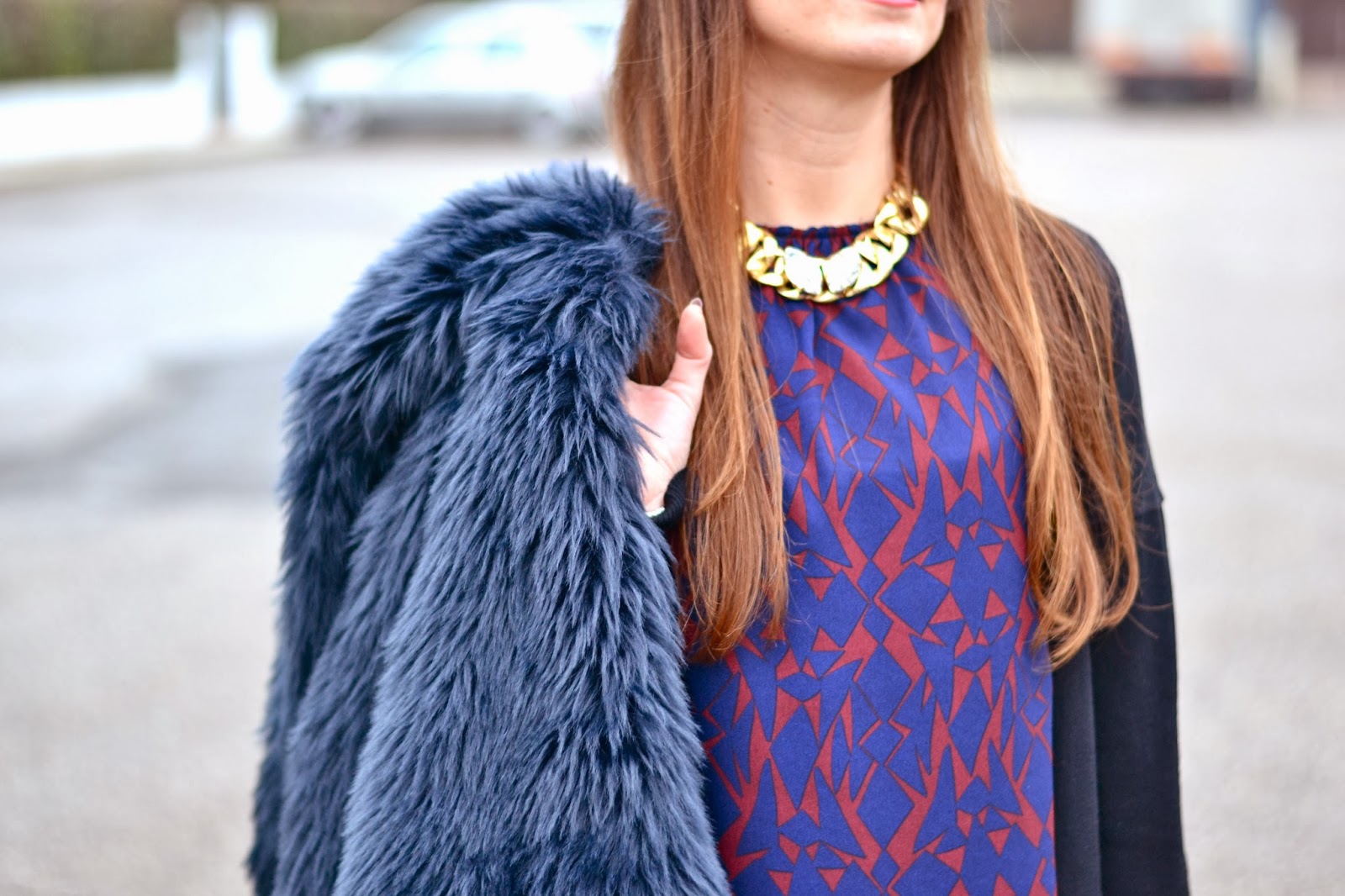 Bordeaux e blu, che per effetto ottico richiamano il viola. Un mix che mi fa impazzire. Un abitino leggero dalle fantasie geometriche e caleidoscopiche e un pellicciotto sintetico per stare calda. E anche una giornata grigia e noiosa prende colore. Buon week end! Kiss! Burgundy and blue, optical effect reminiscent purple. A mix that makes me crazy. A light dress from kaleidoscopic geometric patterns and a faux fur to keep warm. It also takes a day dull and boring color. Happy weekend! Kiss! |