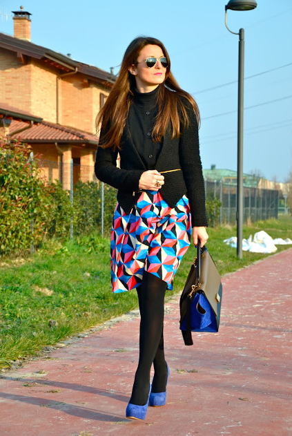 | Questo è un look che mi piace tanto per via dei dettagli blu elettrico e delle geometrie della gonna. L’ho utilizzata anche alla MFW, vi ricordate? |