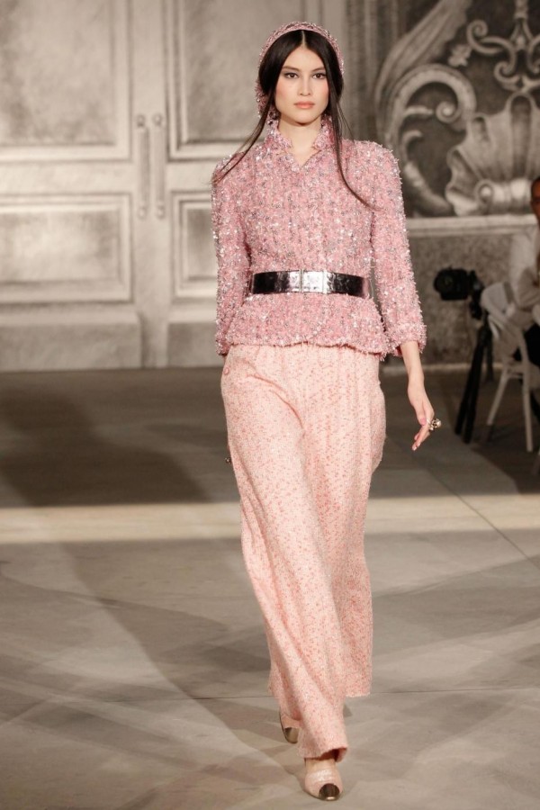 Classica eleganza Chanel per questa collezione molto femminile e bon ton. I tailleurs in lana bouclè sono i protagonisti, insieme ad abiti preziosi riservati ad occasioni speciali. Tanto rosa in tutte le declinazioni: pesca, cipria, champagne, a contrasto con nero, grigio, argento e illuminato da un tocco di bianco. Nonno Karl non sbaglia un colpo!