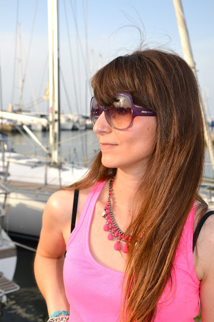 Giro in bicicletta al mare: questo è il porto turistico di Cervia, località della riviera romagnola che adoro. Per stare comoda, ho scelto un altro easy look, che è anche molto economico: canotta fluo di Terranova 4,90 euro; shorts di pizzo Zara 29,95 euro; collana Zara 16,90 euro; sandali no brand 45 euro. Che ne dite?Bike rideat the sea:this is themarinaof Cervia, a town on Adriatic coastthat I love. Tobe comfortable, Ichose anothereasy look, which isalso very cheap: Terranova vest 4.90 euros; Zaralaceshorts 29.95euros;Zara necklace 16.90euros, no brandshoes45 euros. Whatdo you think?