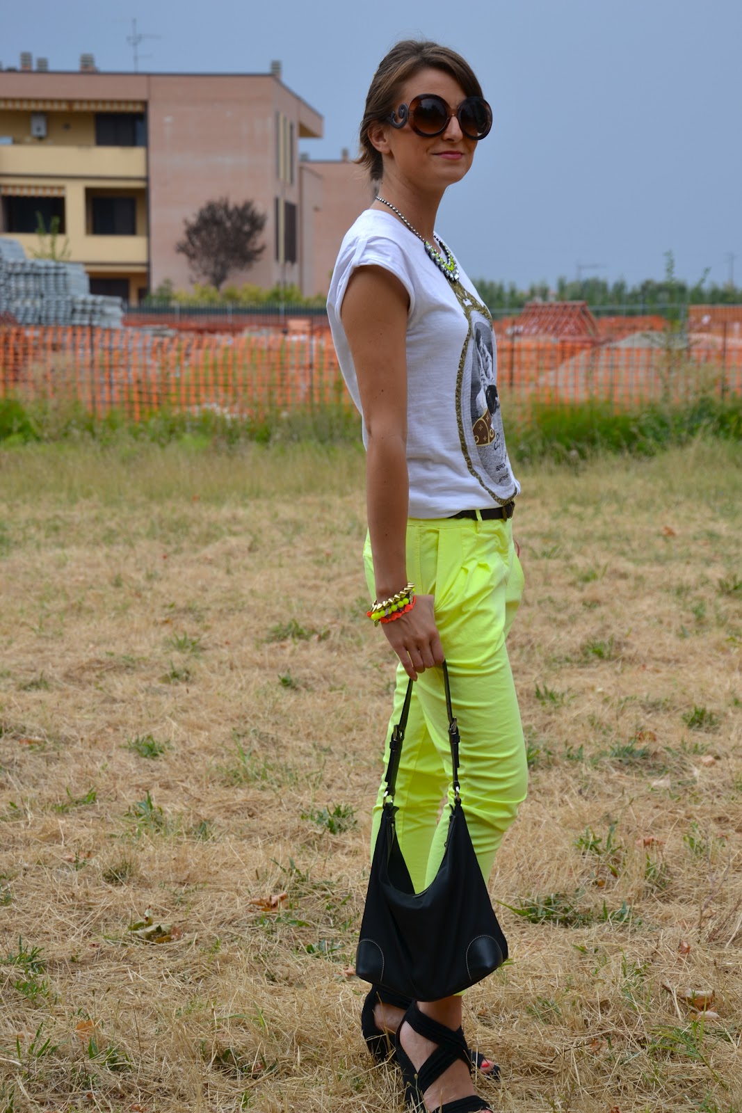 Tee: Happyness; necklace: HM; pants: no brand; bag: Prada; sunnies: no brand, wedges: Lovely Pepa for Krak.