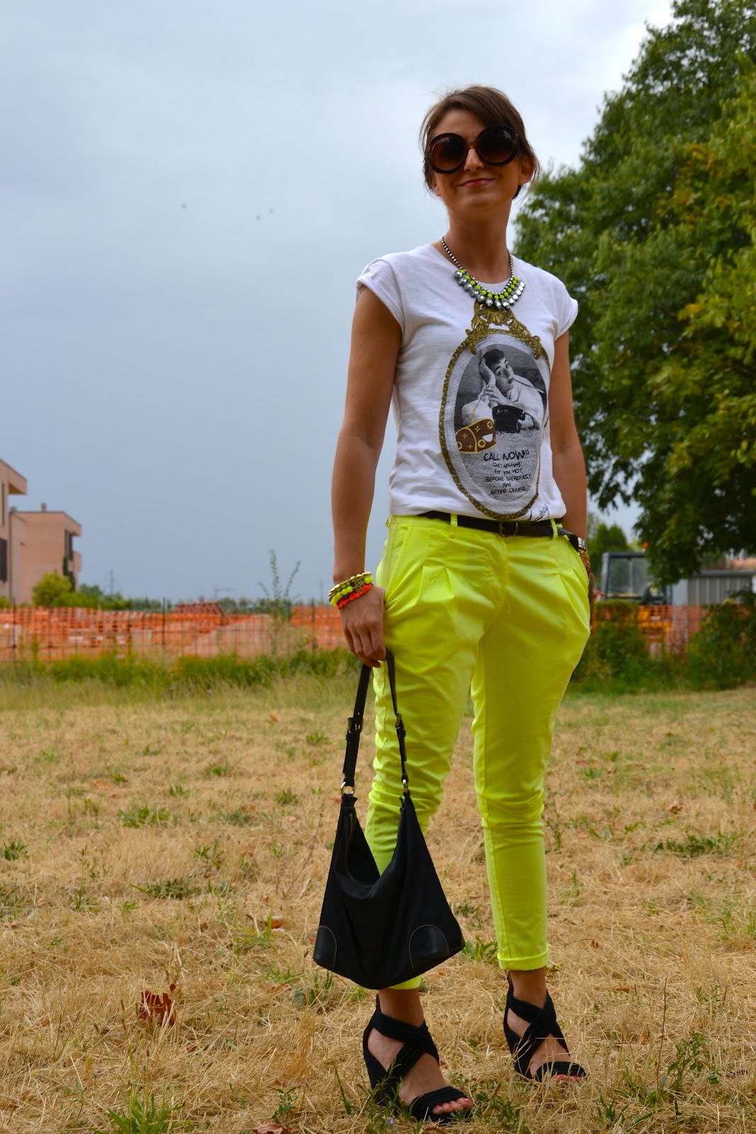 Tee: Happyness; necklace: HM; pants: no brand; bag: Prada; sunnies: no brand, wedges: Lovely Pepa for Krak.