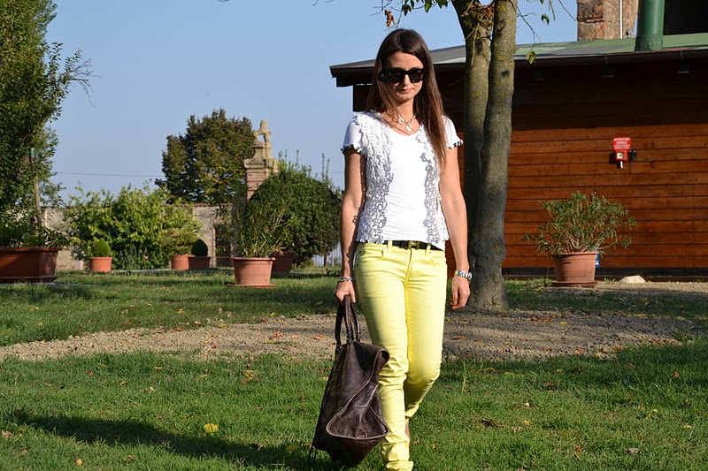 This afternoon there was a beautiful light, perfect for taking photos. Et voila, outfits invented at the time: the new pants just arrived from www.yoox.com, white t-shirt with studs in the sleeves and vest vintage hand made crochet by my mother as a girl. The only indecision shoes. So I took some pictures with the bronze flats, and other with the blue pumps . I liked both of them and you which prefer?