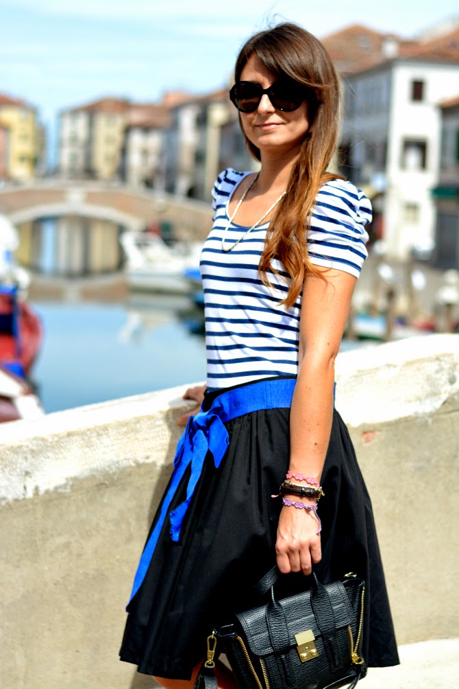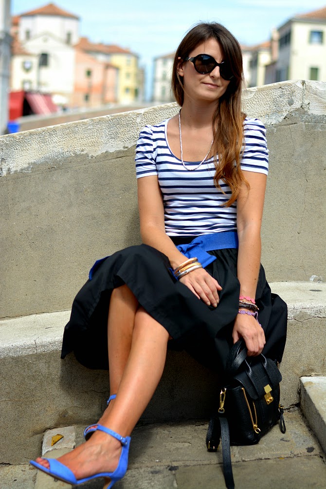 Skirt: Dixie; tee: Zara (old); heels: H&M new collection; bag: 3.1. mini satchel bag by Phillip Lim; sunglasses: Cartier; bracelets: BYS by Bysimon and Cruciani.