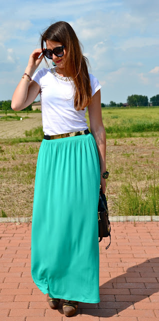Purtroppo ci sono alcuni lati negativi, come per esempio i capelli in disordine e la maxi gonna che in alcune foto sembra un paio di pantaloni… Comunque a me piace tantissimo, l’ho cercata a lungo di questo colore e l’ho poi trovata casualmente da Kontatto a Milano Marittima. Prezzo: 26 euro. Oh yess! Indecisione: sta meglio con le ballerine nere borchiate o con i sandali zeppati?
