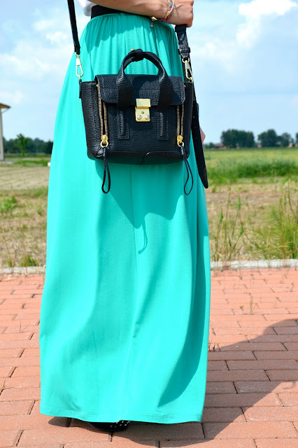 Beautiful windy day: perfect for taking photos, I love the wind. Unfortunately there are some downsides, such as the hair in disorder and maxi skirt that in some photos it looks like a pair of pants Anyway I love it, I have long looked for this color and I then found accidentally at Kontatto store in Milano Marittima. Price: 26 . Oh yes! Indecision: better off with the studded black flats or with heels?