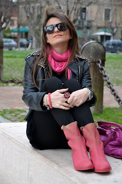 Cosa c’è di meglio di qualche tocco di pink nell’ennesima giornata grigia??? Ecco i miei nuovi stivaletti El Campero, che avevate già visto QUI. Li ho tenuti addosso tutto il giorno, sono comodissimi! Collana e anello sono di Nena’s Bijoux. Vi piace questo look un po’ biker?   HI! What‘s better than a touch of pink in yet another gray day?? Here are my new boots El Campero, that you had already seen HERE. I kept them on all day, they are so comfortable! Necklace and ring by Nena’s Bijoux. Do you like this look a bit ‘biker?