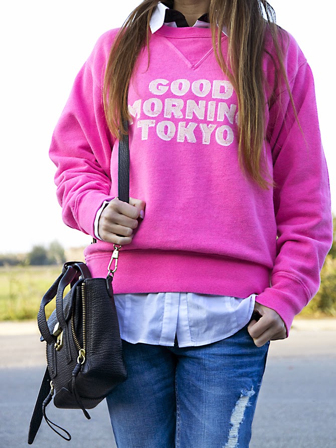 Oh I love the pink sweatshirt with the distressed denim, great look!
