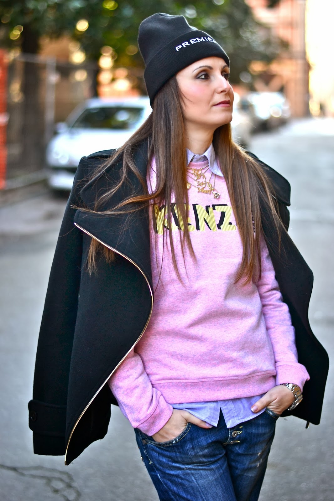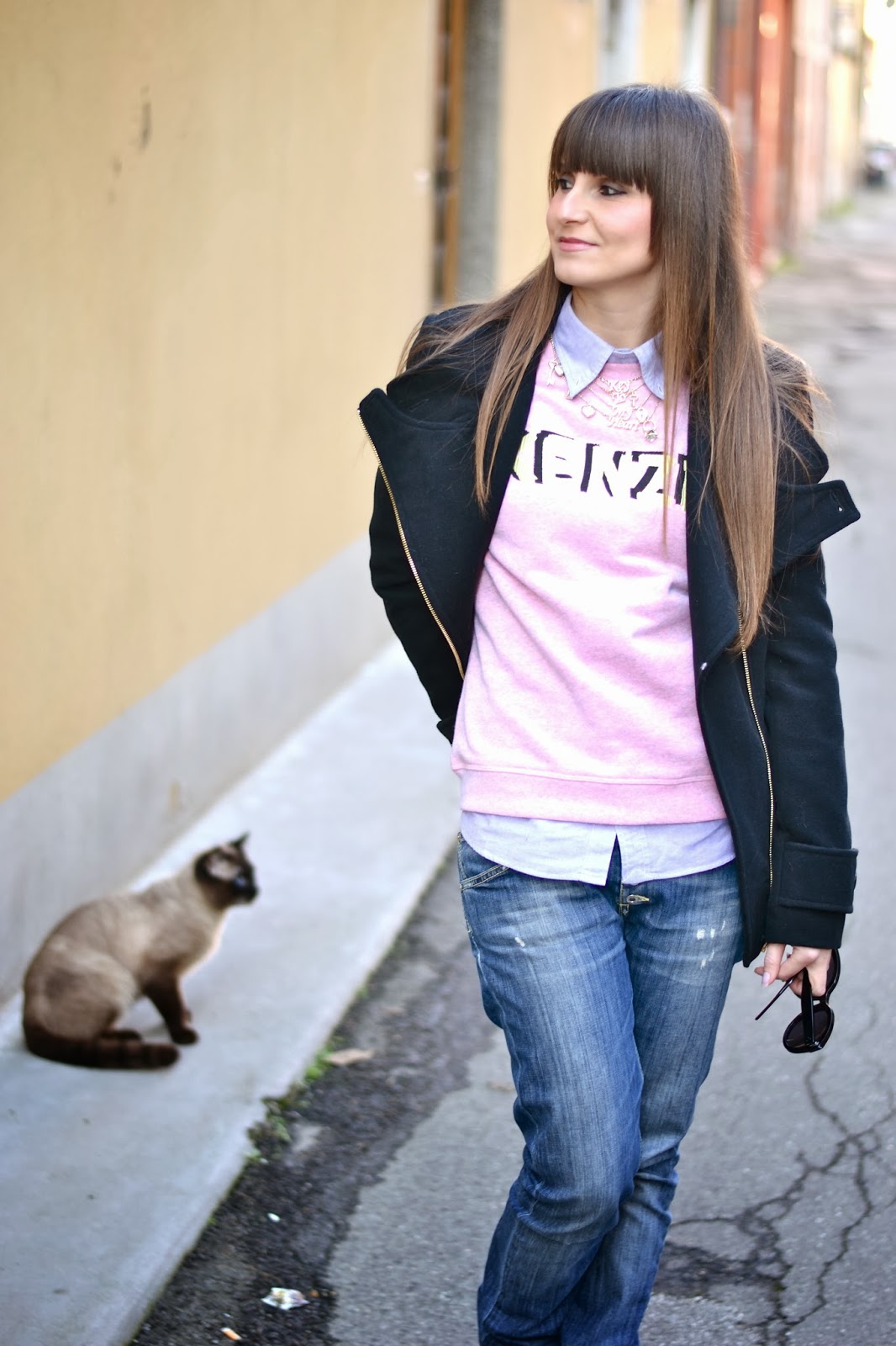 Buongiorno! Oggi per me un look comodo e casual, mi serve proprio un tocco di colore in queste giornate così grigie e noiose e la felpa rosa di Kenzo è perfetta. Volevo scrivere nel titolo boyfriend jeans, perchè questi sono un po’ larghi (soprattutto dietro) ma poi mi sono detta: boyfriend jeans a chi, se il boyfriend non c’è? E allora sono jeans e basta. Molto comodi. E’ venerdi oggi, non mi sembra vero, forse perchè oggi mi aspetta una riunione lunga e impegnativa e arriverò a casa stasera tardi… Va bene lo stesso dai, un cappuccino caldo rallegra subito la giornata e si riparte di slancio. Un bacio a tutti voi!  Good morning! Today, for me, a casual and comfortable look, I need just a touch of color in these days so gray and boring and the pink sweater by Kenzo is perfect. I wanted to write in the title boyfriend jeans”, because they are a bit wide (especially behind) but then I said to myself: boyfriend jeans to those who, if the boyfriend is not there? And then they are just jeans. Very comfortable. It‘s Friday today, does not seem real, maybe because today I expect a long and busy work meeting and get home late tonight Is it okay to do the same, a hot cappuccino welcomes immediately the day. A kiss to you all!
