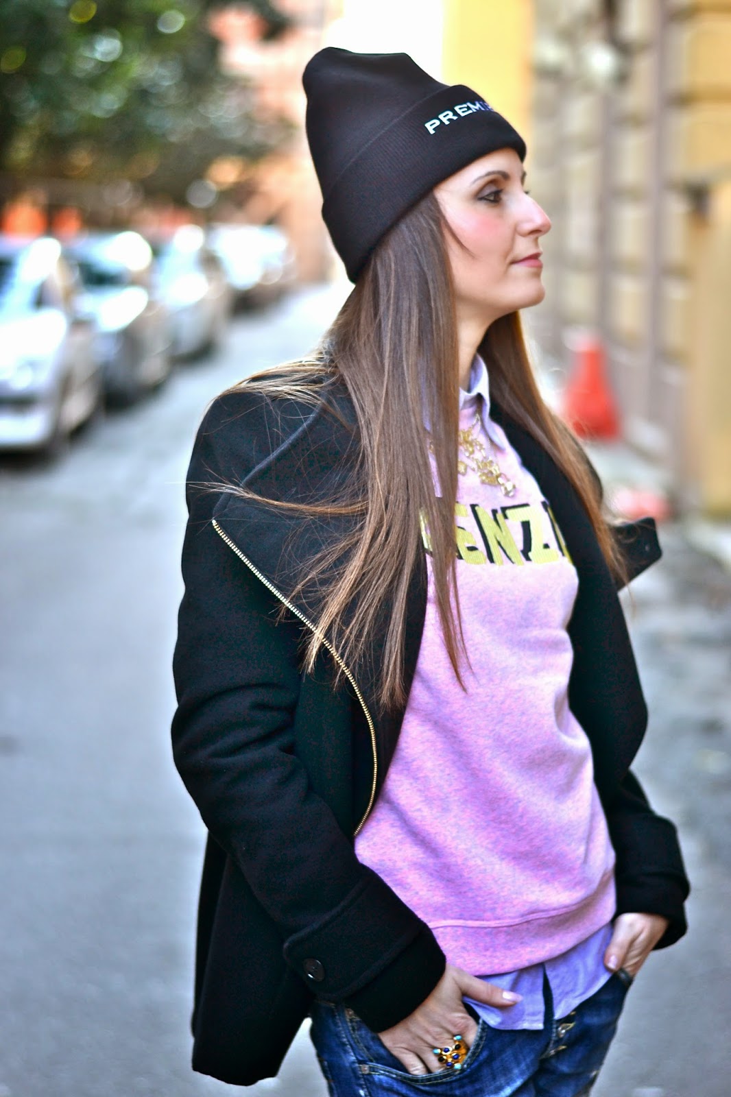 Sweatshirt: Kenzo cruise collection; shirt: Ralph Lauren; jeans: Dondup; Necklace: CHOIES; beanie: PREMIERE; jacket: Rinascimento; boots: Giuseppe Zanotti.