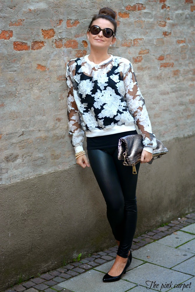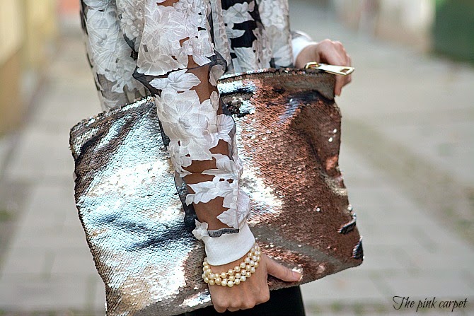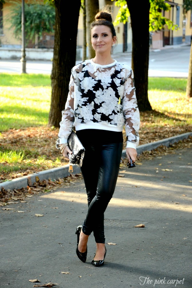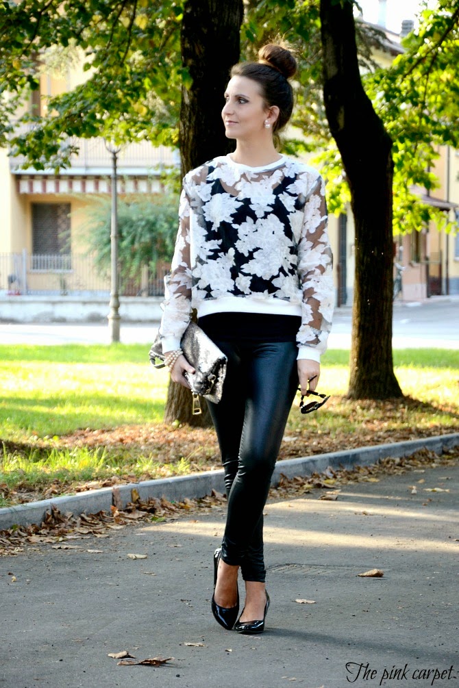 Black and white con un tocco di argento, questo rimane sempre il mix di colori che preferisco per ogni occasione. La stampa a fiori bianchi che gioca con le trasparenze è stata una piacevole scoperta ed è divertente abbinarla a diversi capi. Questa volta ho voluto renderla grintosa indossandola su leggings di ecopelle ma sicuramente non mancherò di assecondarne la femminilità indossandola presto su una gonna midi. Pochi accessori, soltanto qualche perla, perchè il tocco di luce è assicurato dalla splendida clutch in paillettes di AGL. Buona settimana a tutti!