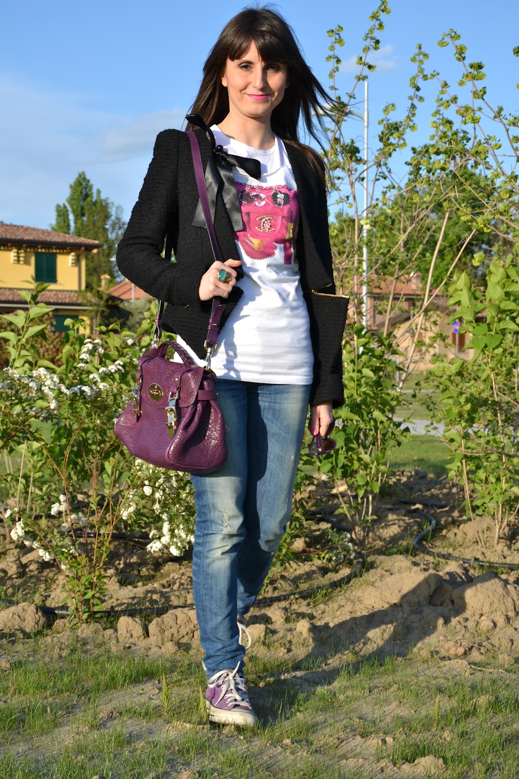 Jacket: Zara; tee: Kryplos; jeans: Cycle; shoes: Converse; bag: Mulberry; ring: YSL