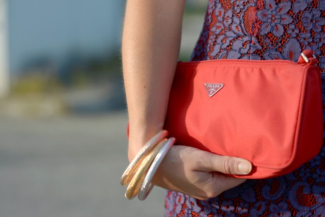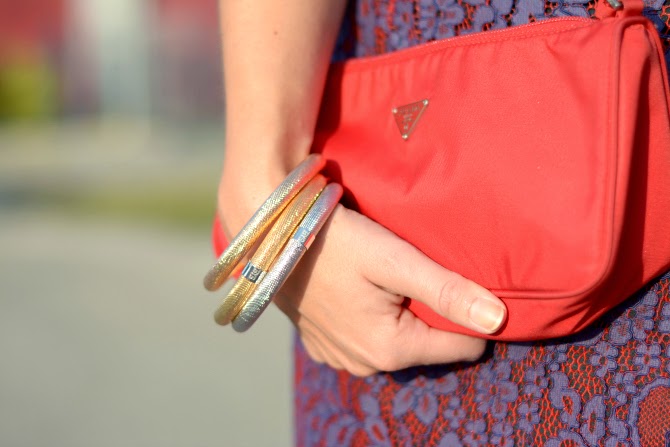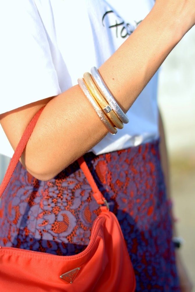 | Skirt and tee: Zara; shoes: Mango; bag: Prada; bracelets: Cruciani; bangles: BYS by Bysimon |