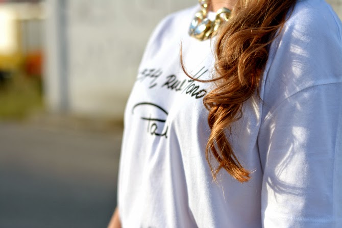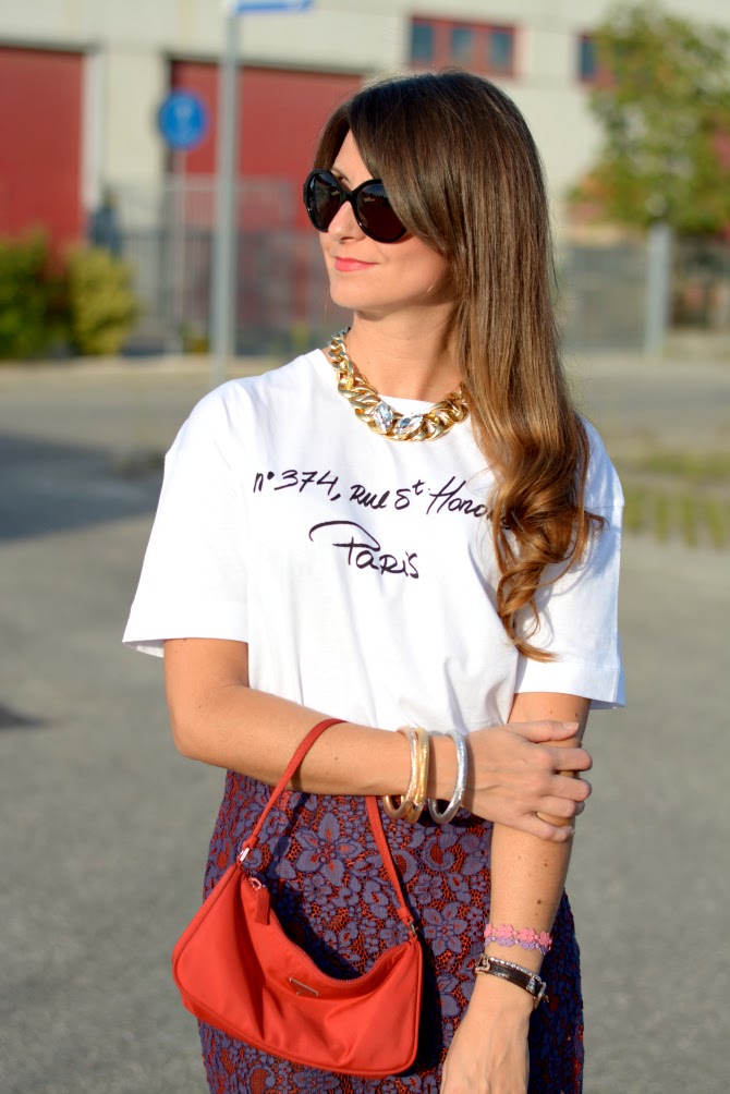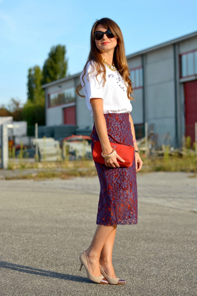 Da alcuni mesi conservo questa gonna in pizzo nell’armadio in attesa di trovare l’abbinamento giusto, in effetti non è per niente facile. Sapete quando ci si innamora all’istante di un capo e si acquista senza ragionare sui possibili accostamenti e sulla sua reale praticità? Ecco questo è uno di quei casi, non si dovrebbe mai fare così. Il rischio è proprio quello di ritrovarsi con l’armadio pieno di cose che restano li a vegetare, un vero peccato. Ma talvolta il bello della moda è anche questo: innamorarsi perdutamente di un vestito o di un accessorio e acquistarlo senza farsi troppe domande (a patto che non accada troppo spesso, ahahhaha!). Credo che per questa gonna la soluzione migliore sia quella di creare una contrapposizione e sdrammatizzare la sua eleganza con la semplicità di una t-shirt bianca. Questa maglietta della nuova collezione di Zara si è rivelata perfetta, fa proprio al caso mio. In questo modo mi sento a mio agio anche al lavoro, anche se la gonna è senza dubbio molto impegnativa.