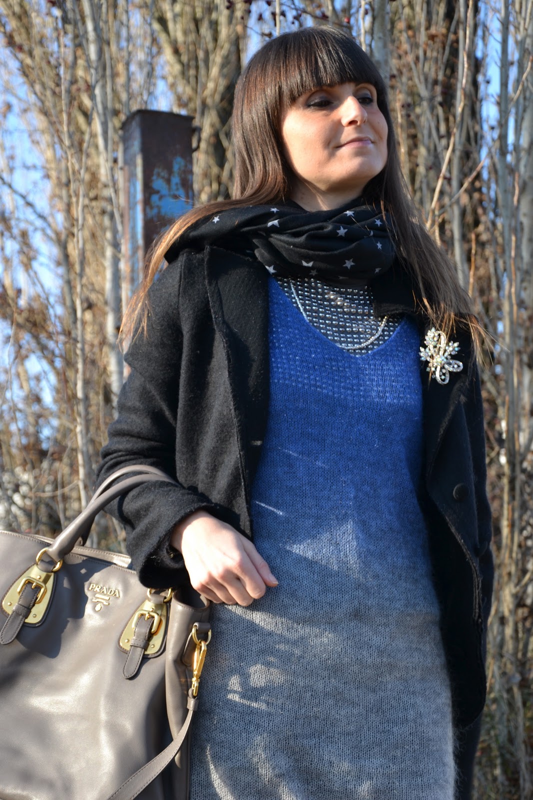 Ecco un morbido maglione sfumato dal blu al grigio in lana mohair, leggera e calda. Ne ho quindi approfittato per costruire un look sui toni del blu e grigio, (“rubando” alla mamma la borsa). Scarpe comprese. Spero che vi piaccia! MI RACCOMANDO PARTECIPATE AL GIVEAWAY PER VINCERE IL PROFUMO FAN DI FENDI!!! Baci