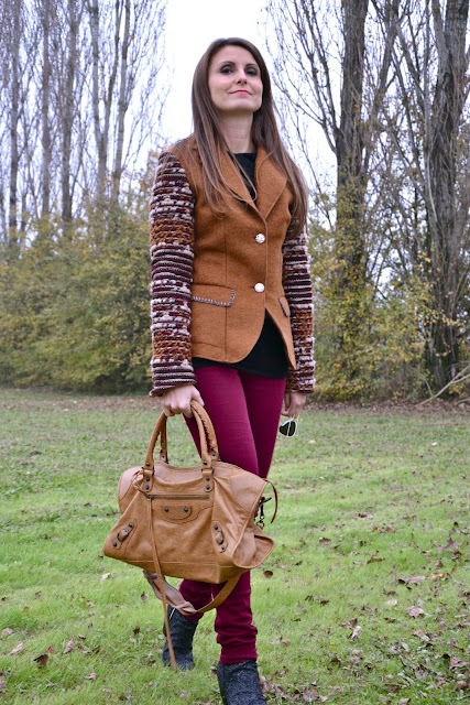 . Morbida e caldissima, e molto raffinata, con i suoi dettagli con filo dorato e bottoni gioiello. La modernità abbraccia la tradizione sartoriale. Quanto mi piace!!! La sto indossando molto spesso in questi giorni e l’ho fotografata in un paio di occasioni. Secondo voi meglio con i jeans o con i pantaloni burgundy che richiamano i fili di lana delle maniche? Buona settimana a tutti! Bacioni!