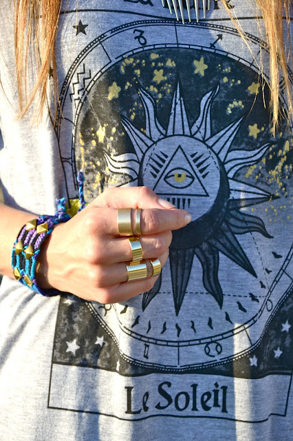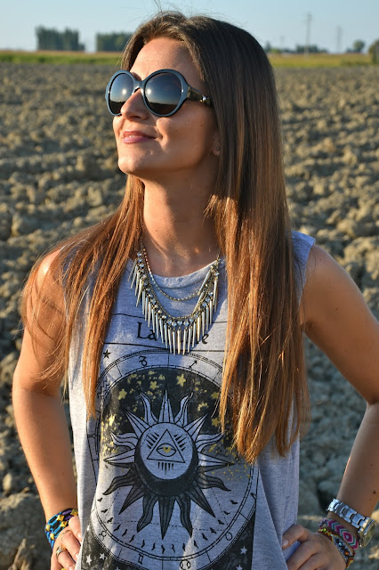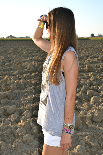 Il post di oggi è interamente dedicato alla mia nuova canotta di Oasap, della quale sono davvero soddisfatta, mi piace tantissimissimo! Sul look non c’è molto da dire, il mio solito mix preferito: shorts e canotta; le foto sono state scattate velocemente al tramonto in una giornata esageratamente calda. Io e daddy siamo scappati via, divorati dalle zanzare…Un accessorio al quale non riesco più a rinunciare? I bracciali dell’amicizia. Questi che vedete con borchiette e brillantini sono di Kettlebell Jewels, l’altro l’ho fatto io. Adesso che ho imparato a farli con tutti i tipi di rombi…ciao! Mi vedrete con le braccia piene! L’altro nuovo arrivo è costituito dal set di anelli dorati,  sempre  di Oasap e li trovate QUI a un prezzo piccolissimo (ok, non saranno Balenciaga, ma fanno una gran figura!) PS Ho visto che le quantità erano limitate, cliccate subito se vi piacciono… Today’s post is dedicated to my new tank top by Oasap, of which I am really pleased, I like so much! The look is my usual favorite mix: shorts and tank top, the pictures were taken quickly at sunset on a day exceedingly hot. Me and daddy we ran away, devoured by mosquitoes An accessory which I can not give up? The friendship bracelets. These you see with studs and rhinestones are by Kettlebell Jewels, the third made by me. Now that I’ve learned to do it with all kinds of diamond patternsYou will see me with my arms full! The other new arrival is constituted by the set of golden rings, always by Oasap, you can find them HERE at a small price (ok, will not be Balenciaga, but they make a great figure!)