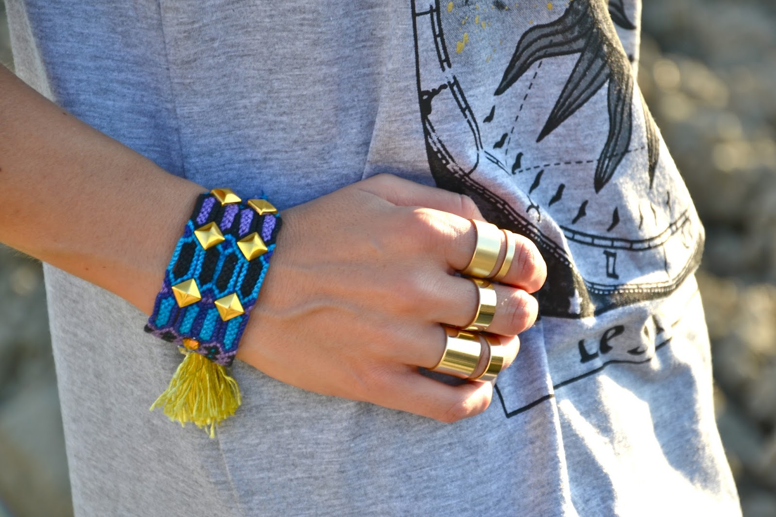 Il post di oggi è interamente dedicato alla mia nuova canotta di Oasap, della quale sono davvero soddisfatta, mi piace tantissimissimo! Sul look non c’è molto da dire, il mio solito mix preferito: shorts e canotta; le foto sono state scattate velocemente al tramonto in una giornata esageratamente calda. Io e daddy siamo scappati via, divorati dalle zanzare…Un accessorio al quale non riesco più a rinunciare? I bracciali dell’amicizia. Questi che vedete con borchiette e brillantini sono di Kettlebell Jewels, l’altro l’ho fatto io. Adesso che ho imparato a farli con tutti i tipi di rombi…ciao! Mi vedrete con le braccia piene! L’altro nuovo arrivo è costituito dal set di anelli dorati,  sempre  di Oasap e li trovate QUI a un prezzo piccolissimo (ok, non saranno Balenciaga, ma fanno una gran figura!) PS Ho visto che le quantità erano limitate, cliccate subito se vi piacciono… Today’s post is dedicated to my new tank top by Oasap, of which I am really pleased, I like so much! The look is my usual favorite mix: shorts and tank top, the pictures were taken quickly at sunset on a day exceedingly hot. Me and daddy we ran away, devoured by mosquitoes An accessory which I can not give up? The friendship bracelets. These you see with studs and rhinestones are by Kettlebell Jewels, the third made by me. Now that I’ve learned to do it with all kinds of diamond patternsYou will see me with my arms full! The other new arrival is constituted by the set of golden rings, always by Oasap, you can find them HERE at a small price (ok, will not be Balenciaga, but they make a great figure!)