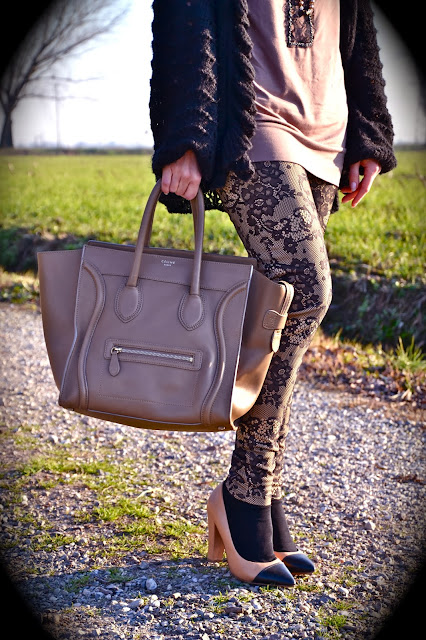| Leggings and blouse: Rum Jungle; bag: Céline; pumps: Zara (old); sunglasses: Céline; cardigan: Undercolors of Benetton (old); coat: no brand. |