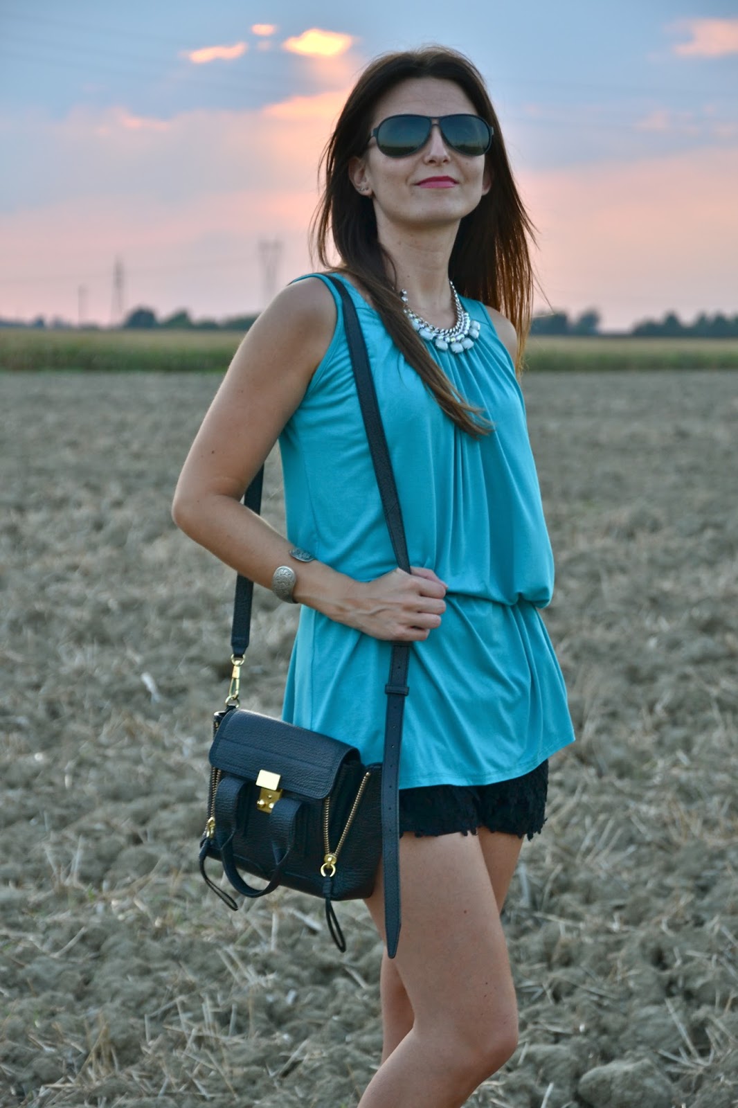 Ciao a tutti, eccomi qui con gli occhiali Firmoo indossati, eravate curiose eh! Secondo me stanno meglio a mio padre, comunque ha ragione, sono davvero leggerissimi! E della collana di Chicnova che ne dite? Con questo top nè verde nè turchese (lagoon direi…) ereditato dal guardaroba di mia mamma che è ingrassata (è disperata…) è perfetta! L’unica cosa che non mi convince del tutto sono gli shorts (i soliti di pizzo di Zara), ho l’impressione che facciano sembrare le gambe più grosse, boh? Hello everyone, Here I am with Firmoo worn glasses, you were curious eh! They’re really lightweight! And what do you think about the necklace by Chicnova? With this top inherited from my mom‘s wardrobe that is greased (it’s hopeless …) is perfect! The only thing that does not convince me at all are shorts (the usual lace shorts by Zara), I have the impression that make it seem bigger the legs, what do you say? P.s. volete provare gratuitamente la qualità Firmoo? Cliccate QUI! |