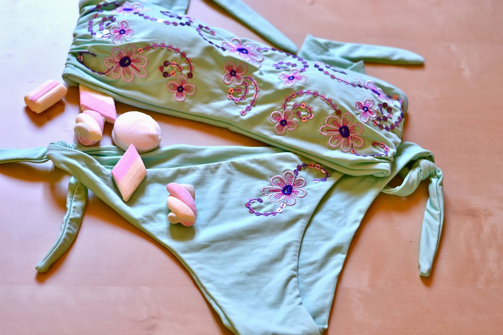 Un  nuovo costume mint green pastelloso, pieno di fiori ricamati e paillettes. E’ di Bikini77 e la nuova collezione promette molto bene: tanti costumi per tutti i gusti, uno più bello dell’altro; io ho scelto un bikini a fascia, il mio modello preferito. Questo è leggermente sostenuto all’interno, per chi come me non sa cosa voglia dire essere maggiorata… Laccetti regolabili nello slip e spalline da aggiungere eventualmente nella fascia. Ottima vestibilità. Estate, mare, sole, pronto ci siete??? Se può arrivare maggio… non voglio stare a casa neanche un week end! Io sono vicina a Milano Marittima, non ci saranno il mare e il clima della Sardegna, ma sempre meglio di niente no? E poi in Romagna c’è sempre tanta allegria!