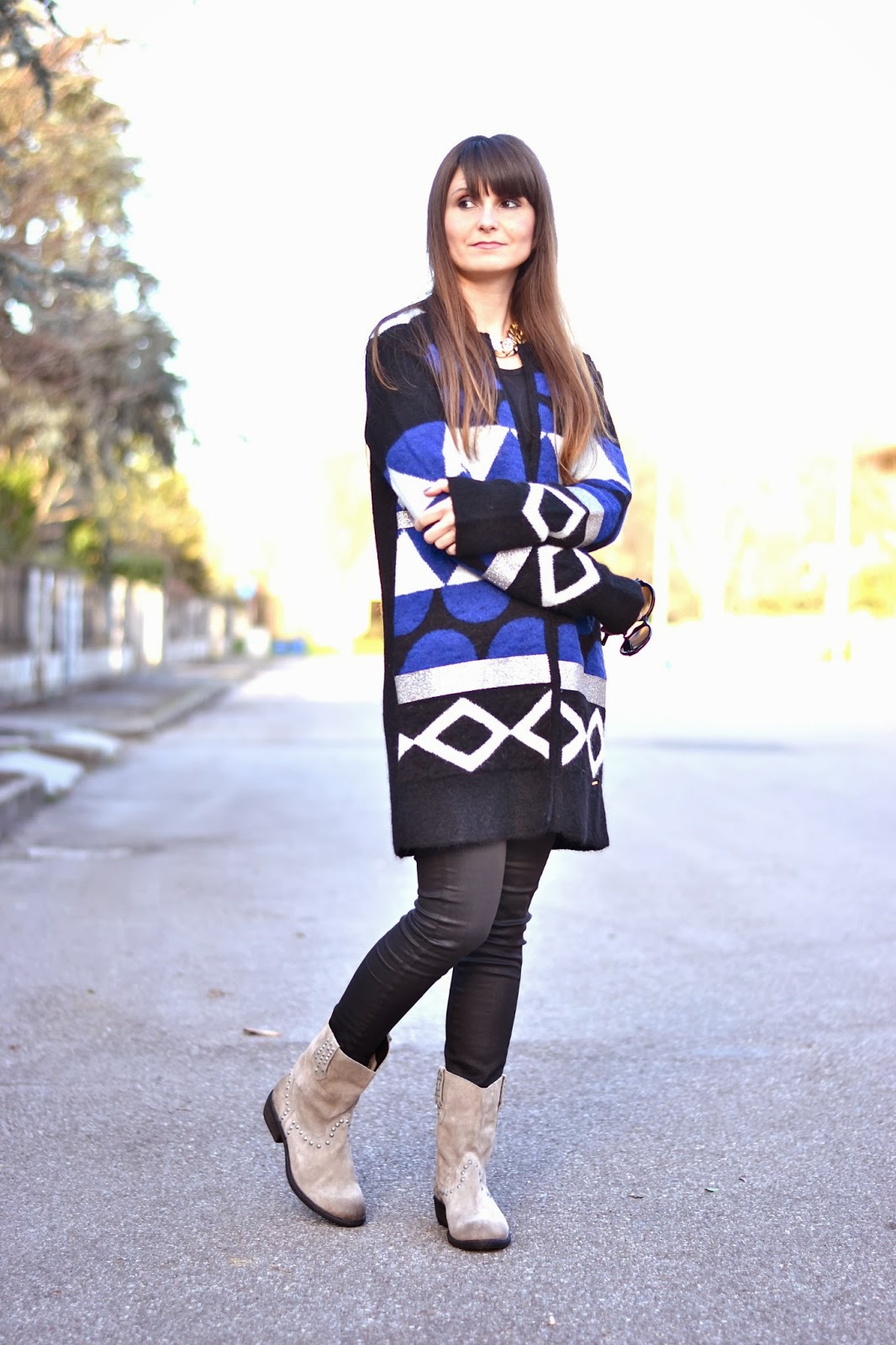 Bonjour! Here I am, I can finally post! You may have noticed (maybe) in the last two weeks I have been published in a discontinuous manner and are not always able to pass on your blog to say hello (have faith, I’ll pass, but I have my times!). The work and a series of commitments that have overlapped I was completely absorbed, also at the end of next week I have the final examination for a master’s degree and to tell the truth I haven’t found the time to study a large part of the program But let us: what do you think of this maxi cardigan by AnnaritaN that may occasionally be used as a coat? I love it and I think that is fine along with studded ankle boots by SKA SHOES. A big kiss and I run back to work. Kiss!