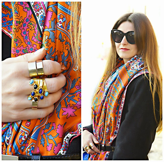 Basta un accessorio come questo per trasformare completamente quello che altrimenti sarebbe un banale cappotto nero e per me l’ennesimo look total black. E per chi come me non riesce proprio a dire di no alla discreta eleganza del nero, anche per i look quotidiani, l’idea di giocare con un foulard colorato può rivelarsi preziosa.