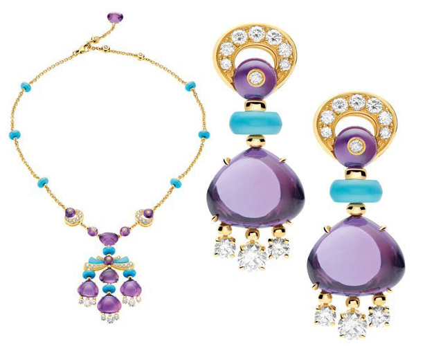 Bè, se si sogna…meglio sognare in grande! Non ho la minima idea del prezzo, ma sicuramente è un privilegio per poche, visto il pregio dei materiali utilizzati: oro 18 kt, ametista di prima scelta e pavè di diamanti. E c’è tutta la linea: bracciale, girocollo, collana e orecchini. Un sogno!!!