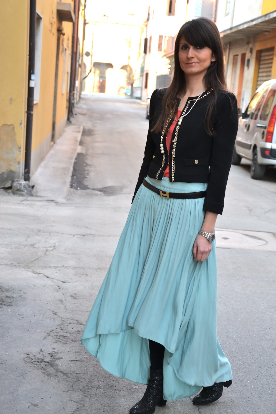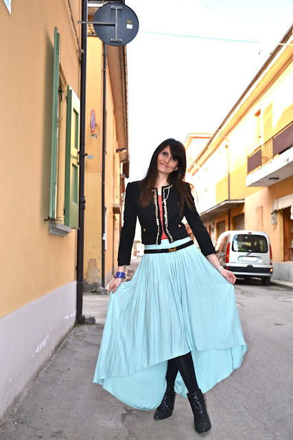 1. La gonna è molto bella: non sono un’amante delle gonne lunghe, ma questa così impalpabile e di questo colore splendido mi piace.