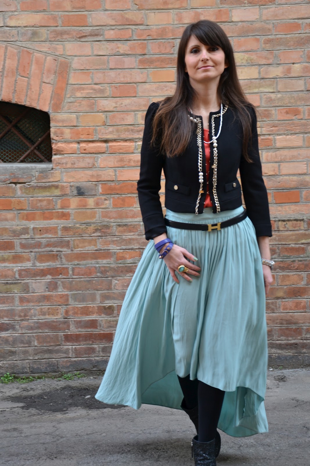 Jacket: Celyn B; top: Les Copains (old); belt: Hermès; skirt: Zara; ring: YSL; bracelet: Balenciaga.