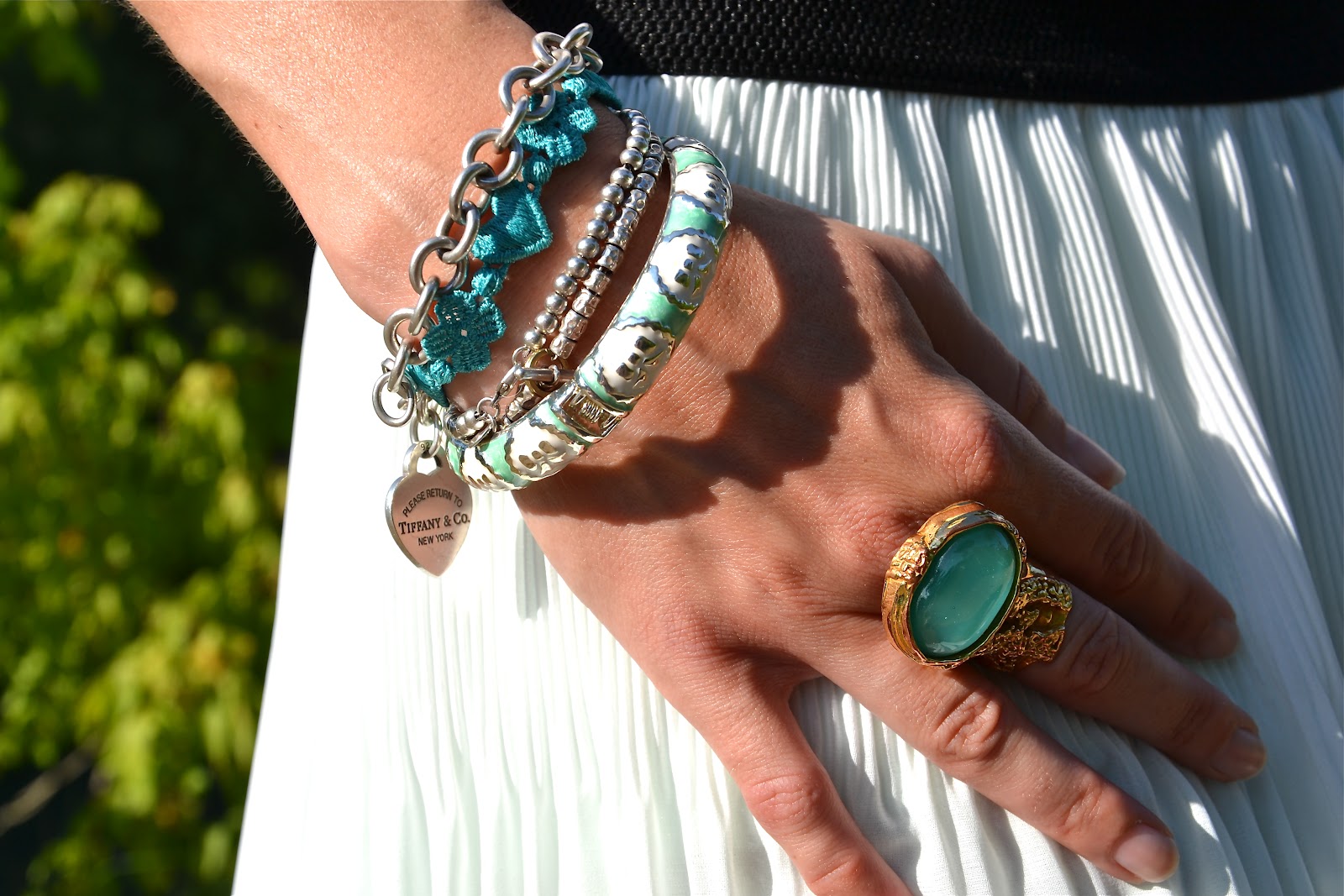 Skirt: Zara; vest: Kontatto; bracelets: Cruciani, Dodo, Tiffany, Sal Y Limon. Ring: YSL.