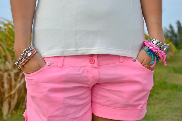 Cèline inspired tee: OASAP, shorts: no brand; neon pink bracelet made by me; necklace: Zara; sandals: Lovely Pepa for Krak.