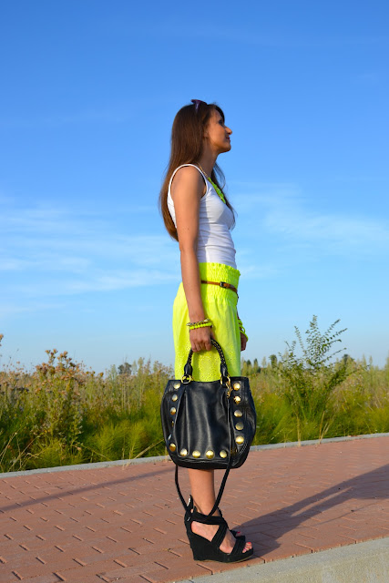 Neon skirt: no brand; vest: HM; bag: Miu Miu; necklace: Storets; necklace as bracelet: HM; wedges: Lovely Pepa for Krak.