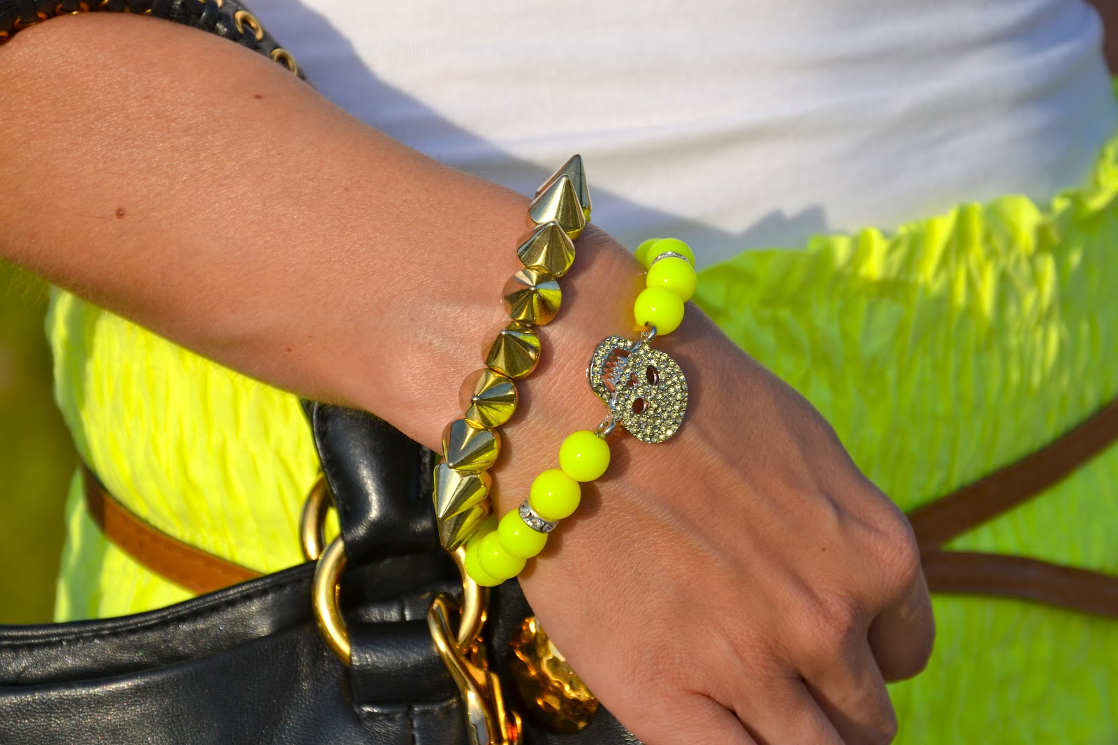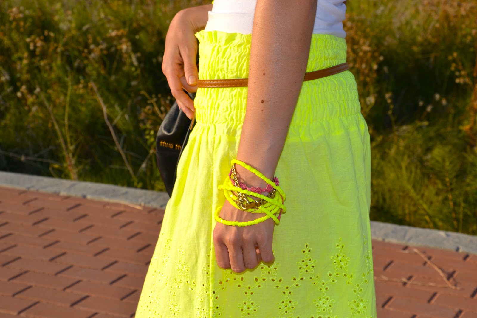 Neon skirt: no brand; vest: HM; bag: Miu Miu; necklace: Storets; necklace as bracelet: HM; wedges: Lovely Pepa for Krak.