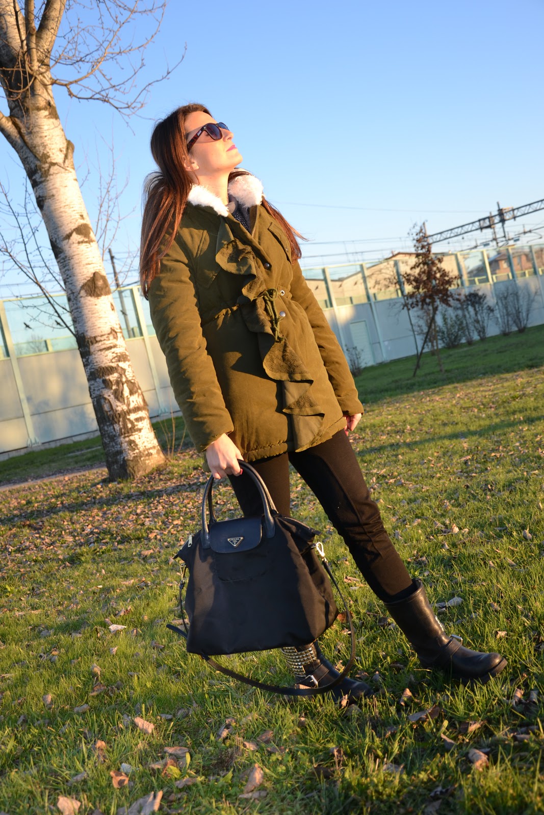 Parka: thanks to Tidestore; sunnies: thanks to Rédélé; pants: Zara; boots: Ash; bag: Prada.