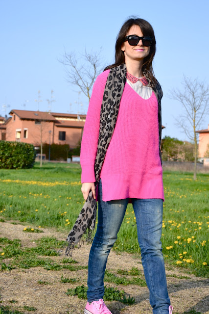 Devo essere stata una Pantera Rosa in una vita precedente…Io mi sento a mio agio proprio così: jeans, morbido maglione (che vento freddo c’era!) e All Star. Niente di particolare, ma trionfa il colore! Super pink!!!