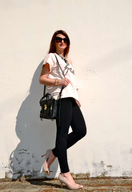 | Sweatshirt and shoes: Mango; leggings: no brand; bracelets: HM; bag: Phillip Lim 3.1 mini Pashli; sunnies: Tom Ford; make-up: Glossip. |