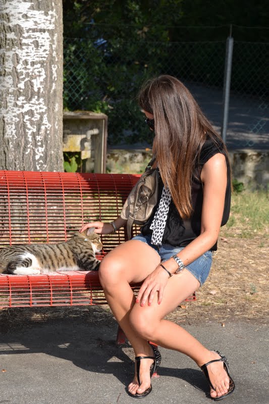Shirt: Roberto Cavalli; shorts: Denny Rose; bag: Balenciaga; flat sandals: Sam Edelman; belt: Prada; bracelets: Tiffany&Co, Guess; sunnies: Cèline; Kiko lipstick n° 508; Diego dalla Palma nailpolish n°104