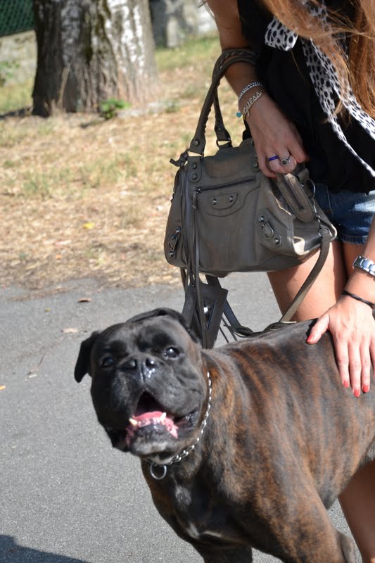 Le foto sono state scattate da..mia mamma, e intanto sono arrivati un  cagnolone boxer che si chiama Tequila e il suo amico inseparabile, un bel gattino di nome Pallino, che sembrava gradire molto la mia Balenciaga…Quindi abbiamo fatto le foto tutti insieme, ecco il simpatico risultato!