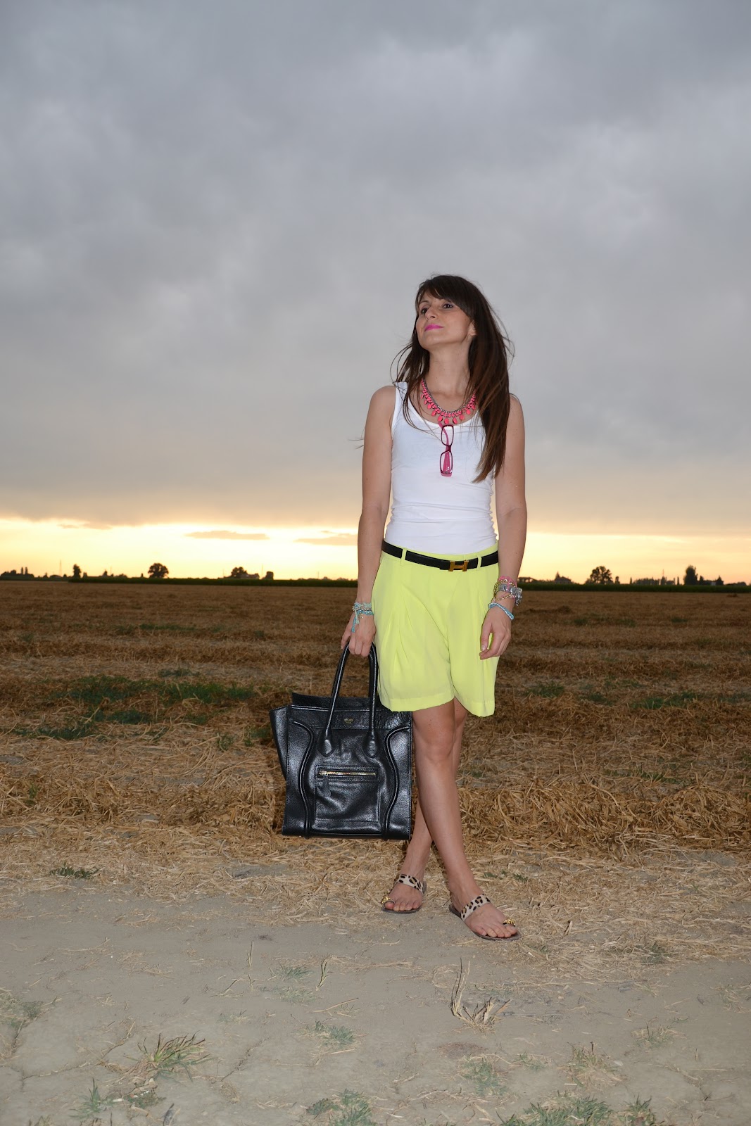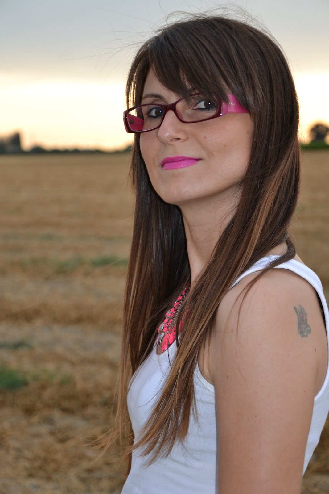 Ahahahaha! Bè, avete l’occasione di vedermi qui in versione “occhialuta”, poichè verso il tramonto la miopia peggiora moltissimo…Prosegue la mia rassegna di cheap look: pantaloncini di Vero Moda, brand che sto apprezzando sempre di più per l’ottimo rapporto qualità-prezzo. Pagati circa 40 euro. Canotta H&M 4,90 euro. Collana Zara 16,90 euro. Sandali no-brand, 45 euro. Ok, se consideriamo anche la borsa non è più un cheap look…ma mi è stata regalata, quindi non vale! :)   I love these pictures taken in a field at sunset. It does not seem the savannah? Ahahahaha! Well, you get the chance to see me here with glasses, as the sunset myopia worsens very much… My review continues with cheap looks: shorts Vero Moda, a brand that I’m appreciating more and more to the excellent quality and low cost. Paid about 40 euros. H & M tank top 4.90 euro. Zara Necklace 16.90 euros. No-brand shoes, 45 euros. Ok, if we include my handbag is no longer a cheap look … but it was a gift, so do not count! :)