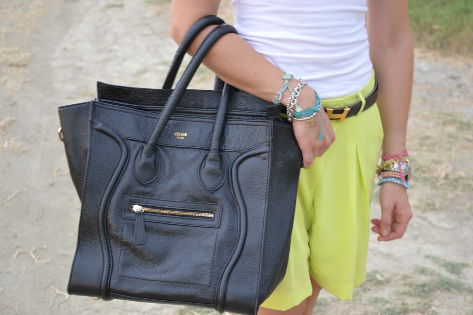 Vest: HM; shorts: Vero Moda; necklace: Zara; bag: Cèline; glasses: Prada; belt: Hermès.