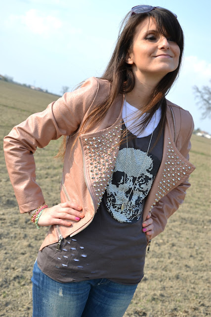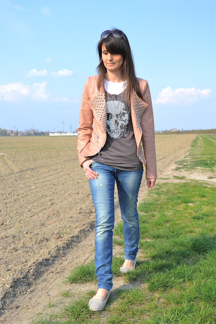 Dalla mia faccia un po’ meno tesa si vede che sto inziando ad assaporare aria di relax…Ormai mancano soli tre giorni alla laurea, la tesi è finita e devo “solo” preparare la discussione (oltre naturalmente ad andare quotidianamente al lavoro). Dai, coraggio, ci siamo quasi! Queto è uno dei miei outfit preferiti, con il quale mi sento a mio agio ovunque: i miei adorati jeans, chiodo borchiato di Queen’s Wardrobe (dal quale ormai non mi separo più) e nuovi mocassini di Jeffrey Campbell. Spero che vi piaccia. Bacioni!
