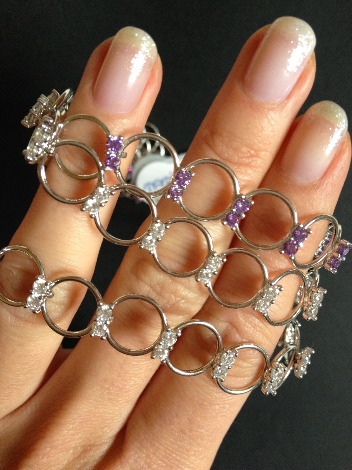 Ciao ragazze, oggi giochiamo un po’ insieme con i bijoux Tatitoto! E’ una linea nuovissima, si chiama Anthea ed è molto giovane e divertente (oltre ad essere molto carina) perchè si tratta di bijoux componibili. I singoli moduli sono lunghi come un bracciale e si possono combinare insieme per ottenere collane lunghe quanto vogliamo. I ciondoli sono provvisti di un moschettone in modo da poterli agganciare sia ai moduli sia agli orecchini; l’unità fondamentale è infatti costituita da un’anellina  che si ripete poi nei moduli. Sono molto luminosi grazie all’accostamento di argento e zirconi disponibili in diversi colori. Io ho scelto il bianco e il lilla. Sono gioielli leggerissimi e davvero deliziosi da indossare. Ho fatto anche un video dove mi sono divertita a creare diverse combinazioni con i miei Tatitoto. I bracciali diventano prima una collana girocollo, poi una collana lunga con e senza ciondolo. E’ il primo video che posto, (e forse l’ultimo) montato da me con i potenti mezzi di cui dispongo (si vede), perciò siate clementi perchè è stato un po’ come dire… problematico. Dobbiamo ancora prenderci la mano… Buona visione!