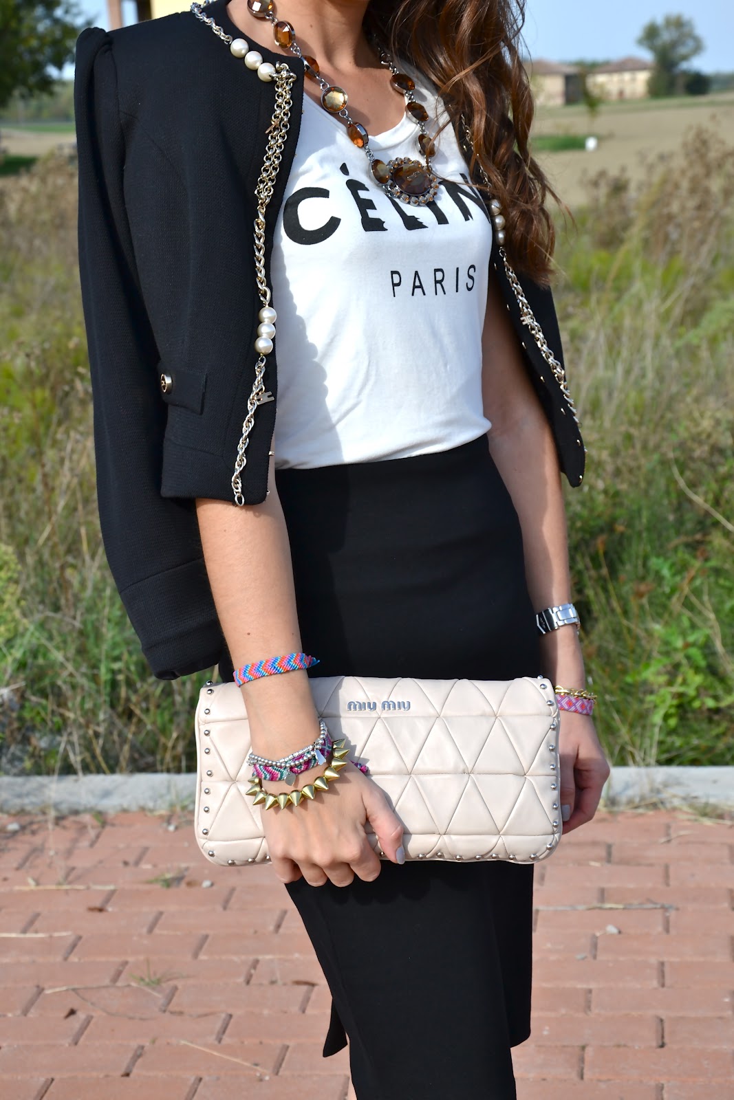 Tee: Oasap; jacket: Celyn B.; necklace+clutch: Miu Miu; skirt and shoes: Zara (old); sunnies: Cèline; friendship bracelets: DIY by me.