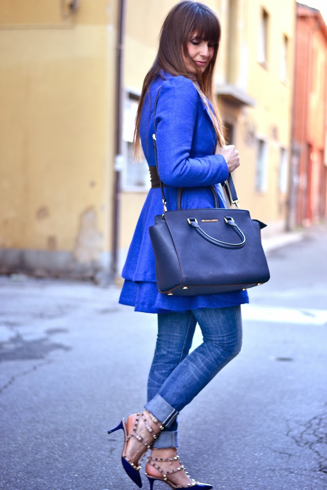 what a perfect outfit in different shades of blue! I really like that coat, the cut and the colour, the heels are adorable and so it the bag.